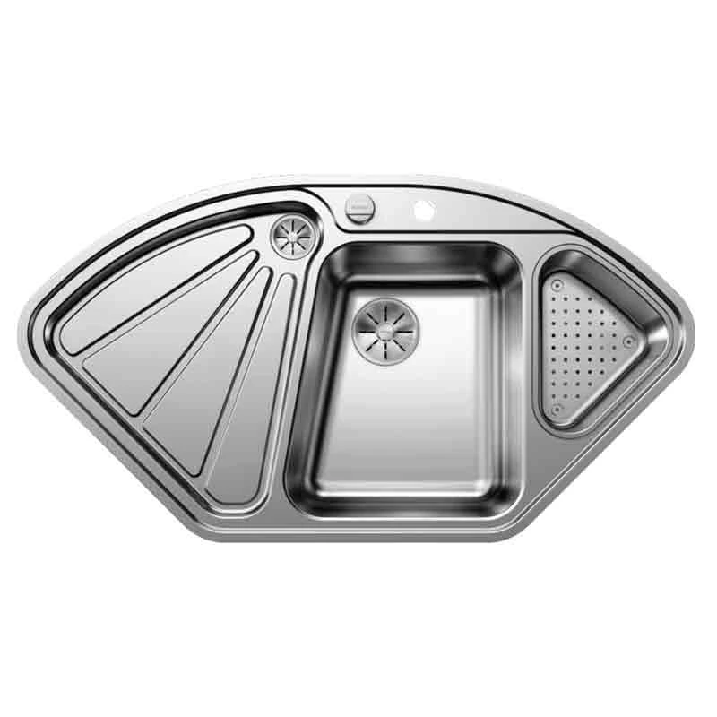 If you’re planning a kitchen on an L- or U-shaped plan, the Blanco DELTA modern corner sink makes the ideal solution for optimal use of space. Placed in a central position, e.g. between the cooking area and the refrigerator, the Blanco DELTA sink model allos you to use the corner section, too. The ergonomically arranged working zones ensure outstanding comfort. High-quality accessories, such as cutting boards and stainless steel colanders, make corner sinks the ideal choice. A matching kitchen mixer tap ensures additional ease of use at the sink. This complete system solution allows you to harness the entire potential of a corner sink.