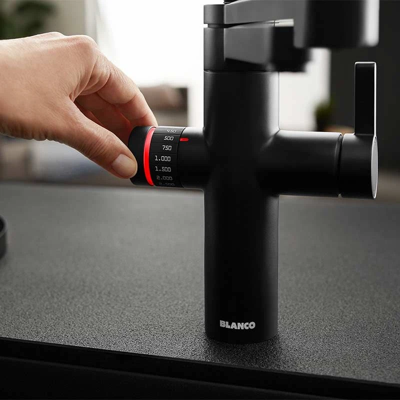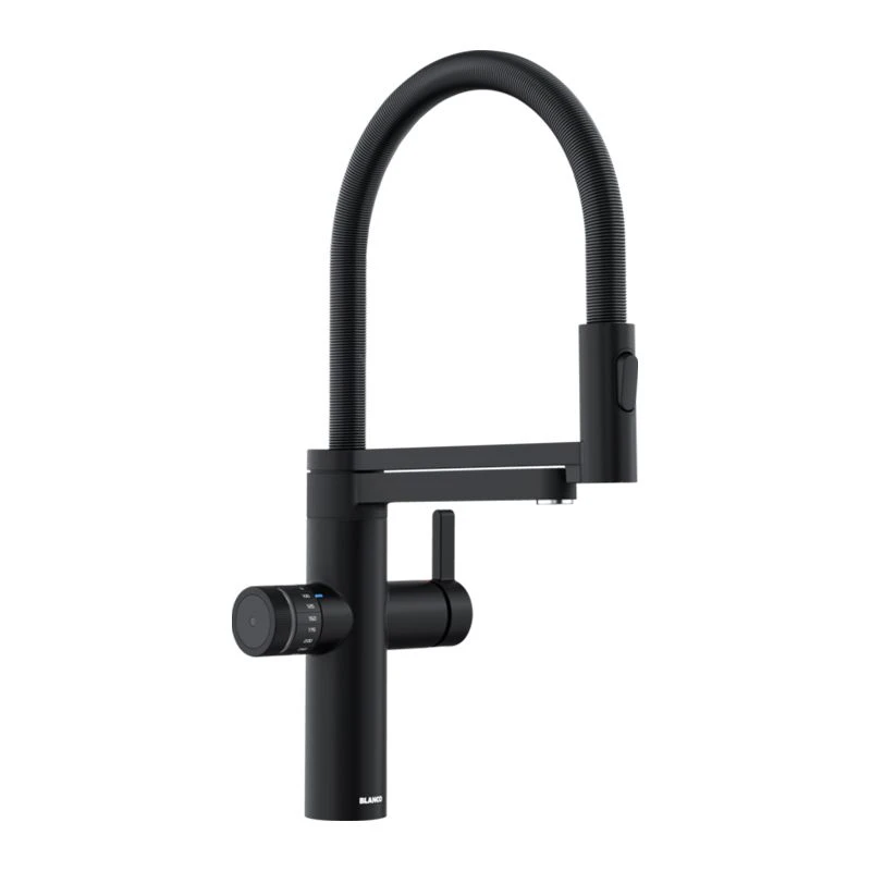 The Blanco drink.hot EVOL-S Pro 4-in-1 Kitchen Tap with Flexible Hose features cold, warm, filtered cold and filtered boiling water, delivering exactly the amount of cold or boiling filtered water you need from a dual spray spout with precise magnetic holder.