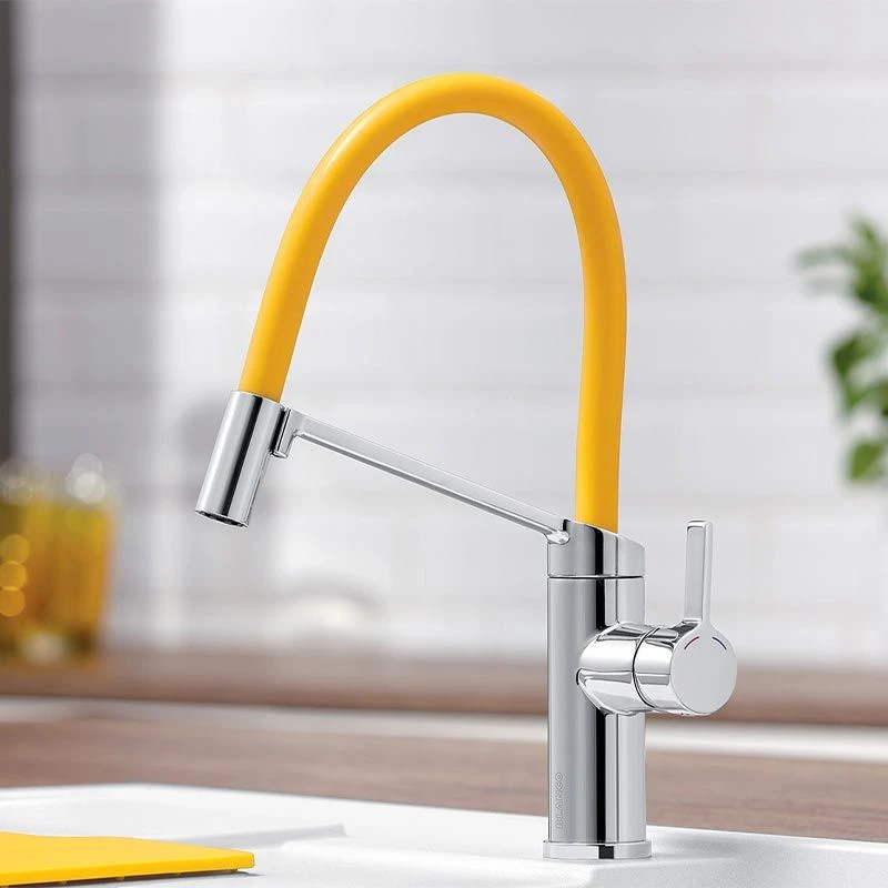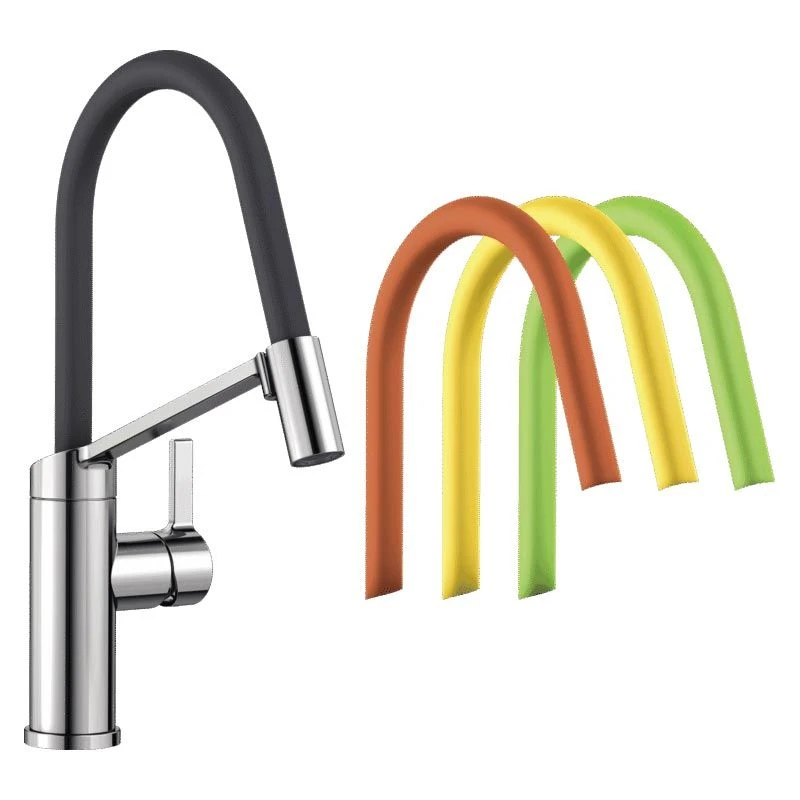 The Blanco VIU-S Flexible Replaceable 4 Colour Hose Galvanic Kitchen Tap features a compact and modern tap with flexible shower hose. This VIU-S kitchen tap includes four interchangeable hose covers for personal design choices, to really make a statement in your kitchen. Kiwi, Orange, Lemon and Lava Grey (pre-assembled).