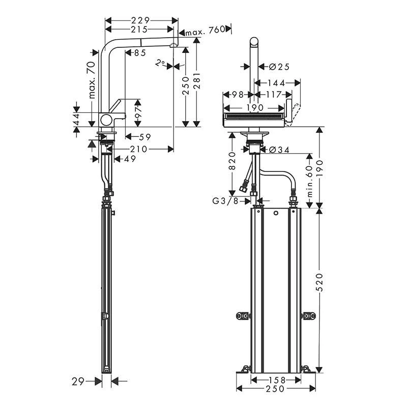 The hansgrohe Aquno also features a LaminarSpray and SatinFlowSpray. The LaminarSpray is a crystal-clear spray type with no added air for the sink. This spray is a great help when going through the day-to-day kitchen routine, e.g. quickly filling large pots or bowls. Efficient with very little splashback. The SatinFlowSpray is a micro-fine, resource-saving spray type that can be used to clean sensitive foods extremely gently. The wide water spray flows from the base of the tap, causing very little splashback in the sink.
