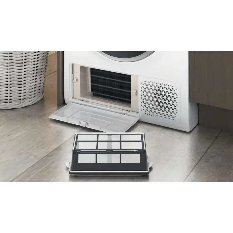 The Hotpoint NT M11 92SK UK 9kg Tumble Dryer boasts an impressive heat pump technology that removes moisture from your clothes and recycles it leaving you and the environment happy. The appliance features a gentle drum cycle that ensures delicate care for all types of clothes via adequate treatment. Don’t want any wrinkles? say less, the pre-iron cycle’s got you covered. It also flaunts a patented Active Care feature that reduces fabric wear by up to 40% minimising stress on clothes and keeping them looking their best longer. For peace of mind this product tops it all with a clever Anti-Allergy option that uses high temperatures to remove bacteria and allergens from your laundry; great for those who suffer from allergies. This Hotpoint NT M11 92SK UK 9kg Tumble Dryer makes saving time, money and effort an every day joy
